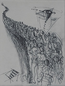 Los grabados expresan de manera cruda y en una monocromía la terrible sordidez de la soledad y la desesperanza de un profesor de filosofía de nuestros tiempos que se encuentra ante el vértigo de la tragedia inminente de ver venir el mundo de este nuevo siglo como un hoyo negro en el espacio de las sociedades y la psique de los hombres actuales…