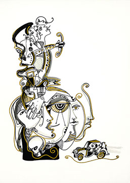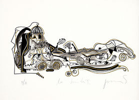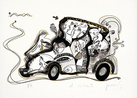 SARAMAGO HOMENAJE El coche II Serigrafía, tinta china negra,dorada y/o plateada sobre papel 70 x 50 cm