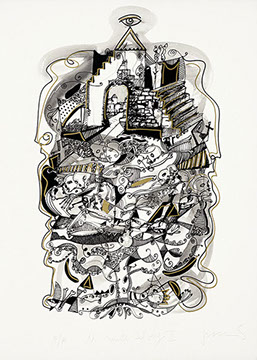SARAMAGO HOMENAJE El destierro II Serigrafía, tinta china negra,dorada y/o plateada sobre papel 70 x 50 cm