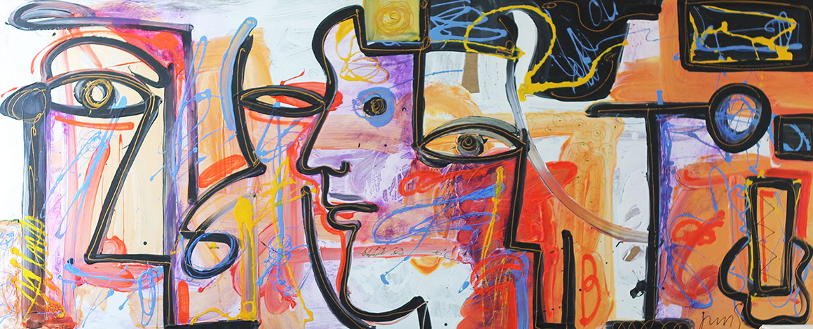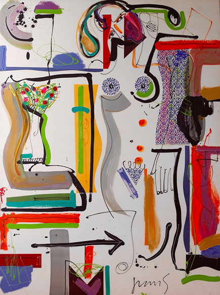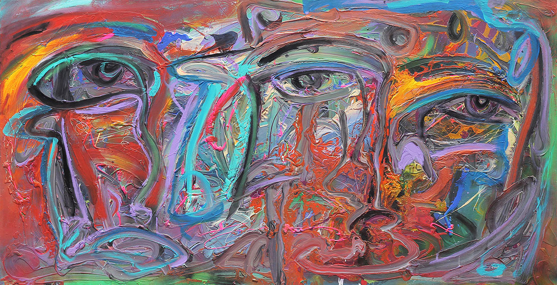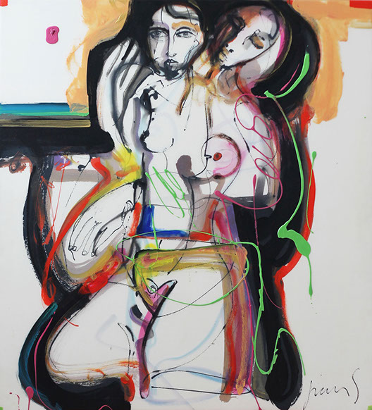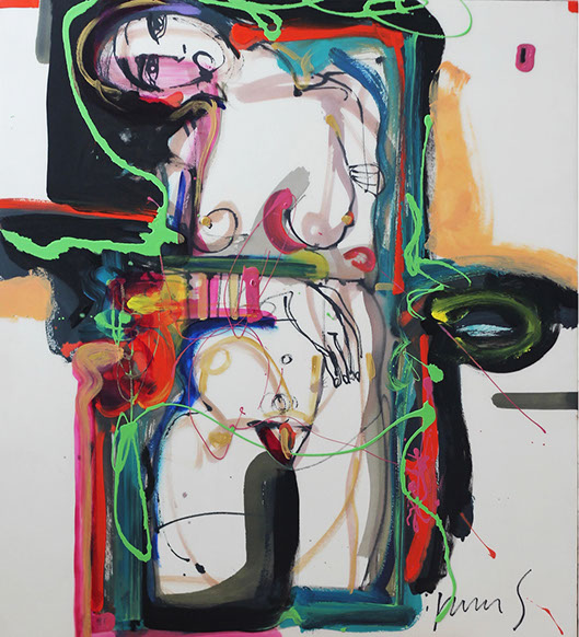 Nada secreto es su afán por decir, por contar; construye retóricas plásticas que recientemente tienden a lo amorfo. Lo abstracto se le asoma en color que expresa su pasión sin narrar. La pintura le guía ahora lejos de los personajes que hace y que le hacen.